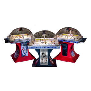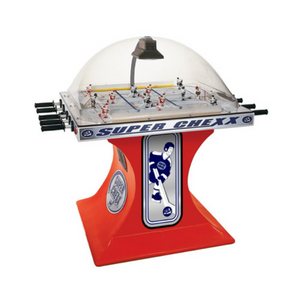 Super Chexx is a coin-operated amusement game and it is one of the all-time classics. Also known as Bubble or Rod Hockey because of the very distinguished, indestructible dome that covers the playfield. The gameplay is fast, exciting, and realistic as the players on either side control all 5-hockey players and the goalie. The game can be played as a one on one game, or in many cases, especially for tournaments, it is played two on two. The game’s new electronics record goals, shots on goal, period, and running time. The running time is operator adjustable. There is an automatic puck return system, overhead dome lighting, and if a game is tied after the normal gameplay it will automatically go into sudden-death overtime – so there’s always a winner.
